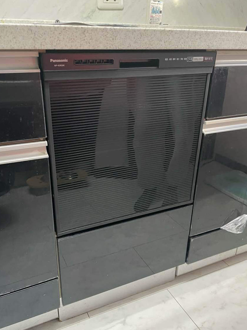 Panasonic製のNP-P45R2シリーズ(スライドオープン・ミドルタイプ・ドアパネル型)の食洗機から、PanasonicのNP-45RS9K(スライドオープン・ミドルタイプ・ドアパネル型)の機種へ交換を行いました。R9シリーズは基本的な性能を備えたベーシックモデルになります。「ストリーム除菌洗浄」は高温水流で洗うと同時に除菌もできるので、雑菌やニオイの心配もありません。上カゴのツインフラップ・下カゴのマルチピンで食器もたくさん入り、出し入れも簡単です。前面操作部はよりシャープになり、すっきりとした印象を与えてくれます。