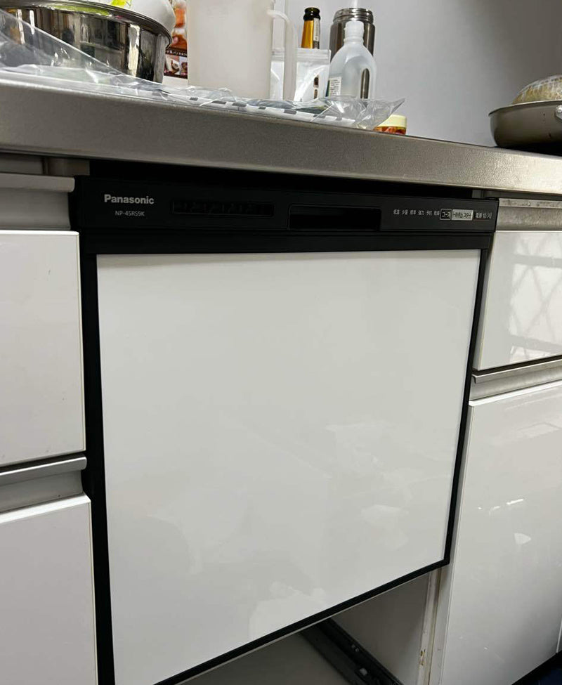 Panasonic製のNP-45RS5KTT(スライドオープン・ミドルタイプ・ドアパネル型)の食洗機から、PanasonicのNP-45RS9K(スライドオープン・ミドルタイプ・ドアパネル型)の機種へ交換を行いました。優れた基本性能を備えたベーシックモデルになります。「ストリーム除菌洗浄」「ツインフラップ」「ブーメラン型ノズル」を搭載しています。50℃以上の高温・高圧水流でしっかり除菌し、ナノイーX送風で庫内の食器類を清潔に保管するため、毎日安心してお使いいただけます。正面のパネルは再利用させていただきました。