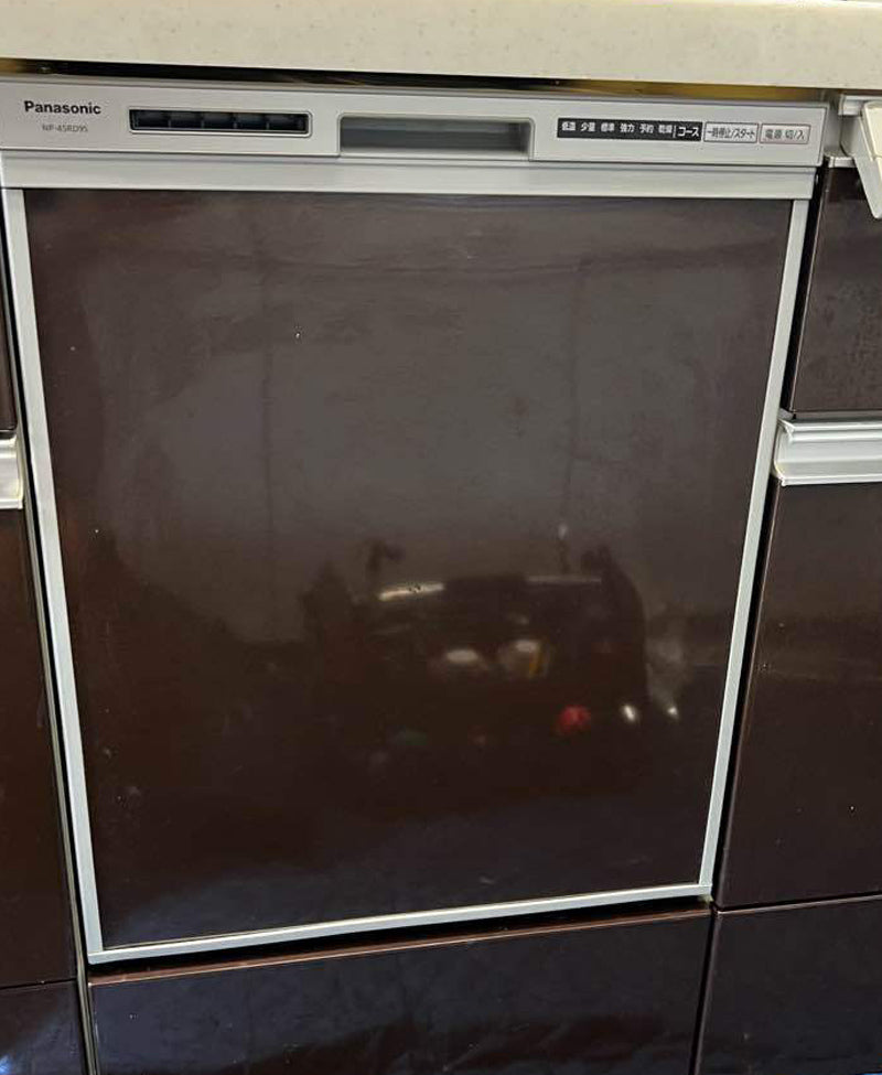 PanasonicのS45VD5SD(スライドオープン・ディープタイプ・ドアパネル型)の食洗機から、PanasonicのNP-45RD9S(スライドオープン・ディープタイプ・ドアパネル型)の機種へ交換を行いました。R9シリーズは基本性能を備えたベーシックタイプの食洗機です。高温・高圧水流で汚れを落とす「ストリーム除菌洗浄」や大きな食器のセットや出し入れが便利な「ツインフラップ」を搭載しています。正面の茶系のパネルはサイズが同じのため、再利用させていただきました。