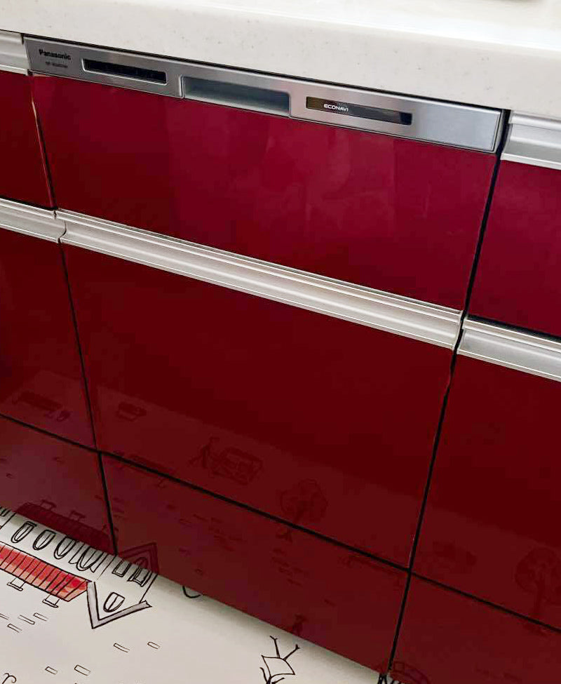PanasonicのSP45MD2WD(スライドオープン・ディープタイプ・ドア面材型)の食洗機から、PanasonicのNP-45MD9W(スライドオープン・ディープタイプ・ドア面材型)の機種へ交換を行いました。M9シリーズはAIエコナビを搭載した節水で省エネ性の高い食洗機です。エコナビの他に「3Dプラネットアーム」「ムービングラックプラス」を搭載しています。ムービングラックプラスは左右にスライドするムービング機能に加え、食器の種類や量に合わせて庫内の形状を4つのスタイルに変えらるため、食器セッティングの自由度が高まりました。