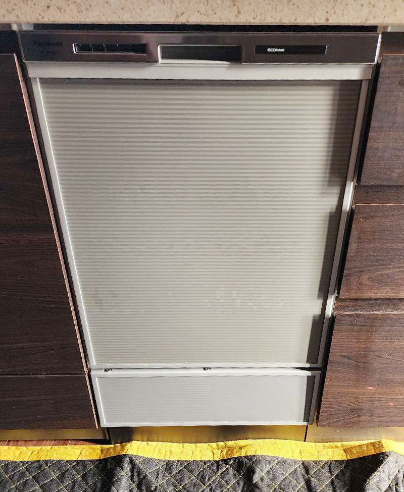 三菱のEW-45R1(スライドオープン・ミドルタイプ・ドアパネル型)の食洗機から、PanasonicのNP-45MD9S(スライドオープン・ディープタイプ・ドアパネル型)の機種へ交換を行いました。M9シリーズは先進の洗浄力と利便性を兼ね備えたハイグレードモデルの食洗機になります。「AIエコナビ」「ムービングラックプラス」「3Dプラネットアーム」を搭載しています。AIエコナビはセンサーが庫内の状況を検知し、汚れや食器量が少ない場合は自動ですすぎ回数を減らし乾燥時間を短縮します。