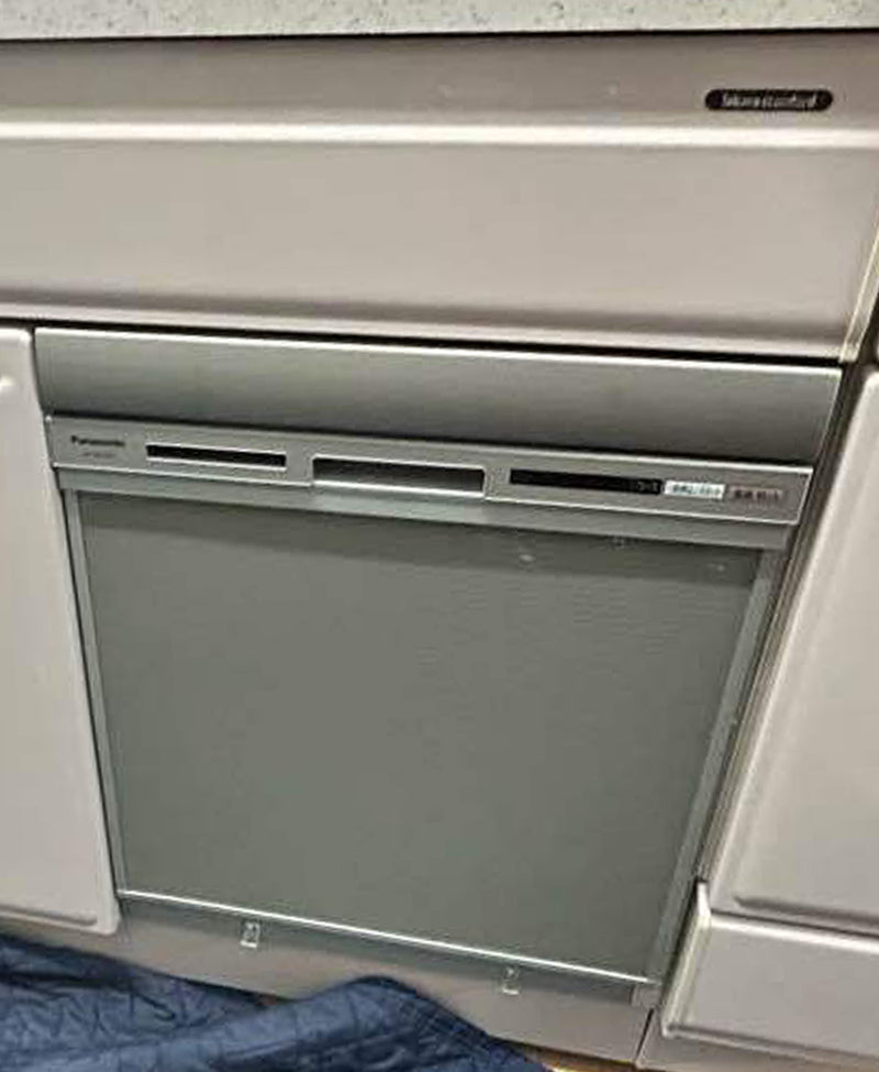 三菱のEW-DP45S(スライドオープン・ミドルタイプ・ドアパネル型)の食洗機から、PanasonicのNP-45VS9S(スライドオープン・ミドルタイプ・ドアパネル型)の機種へ交換を行いました。V9シリーズはライトエコを搭載したハイスタンダードモデルの食洗機です。「ライトエコ」は食器の量をセンサーで検知し、食器の量が少ない時は加熱すすぎ温度を自動制御。乾燥時間を約5分短縮します。「ムービングラック」は上カゴと小物入れを自由にスライドできるムービング機能が便利で食器の出し入れやセットのしやすさが高まります。