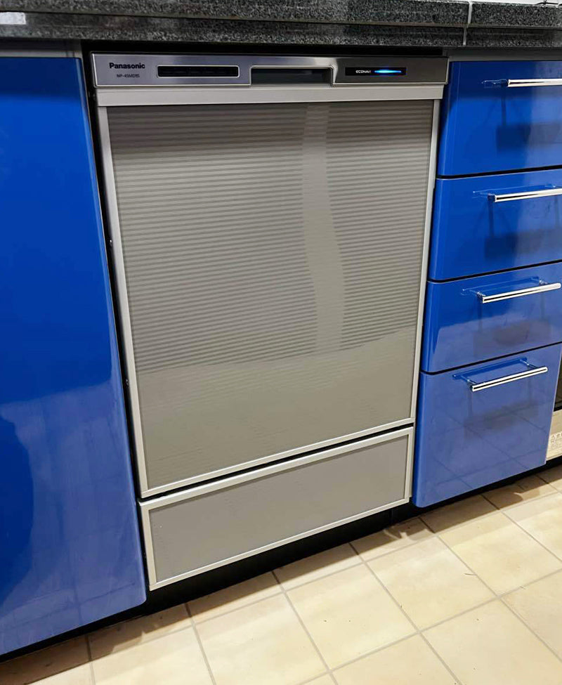 HITACHIのKF-45B6SK(フロントオープン・ディープタイプ・ドアパネル型)の食洗機から、PanasonicのNP-45MD9S(スライドオープン・ディープタイプ・ドアパネル型)の機種へ交換を行いました。M9シリーズは洗浄力と利便性に優れたハイグレードモデルの食洗機です。「AIエコナビ」や「3Dプラネットアーム」を搭載しています。3Dプラネットアームは4つの洗浄モードを自動ローテーション。洗浄水の立体的な噴射で強力な汚れも落とします。深型で容量もたっぷりなので、一度に多くの食器を洗浄可能です。