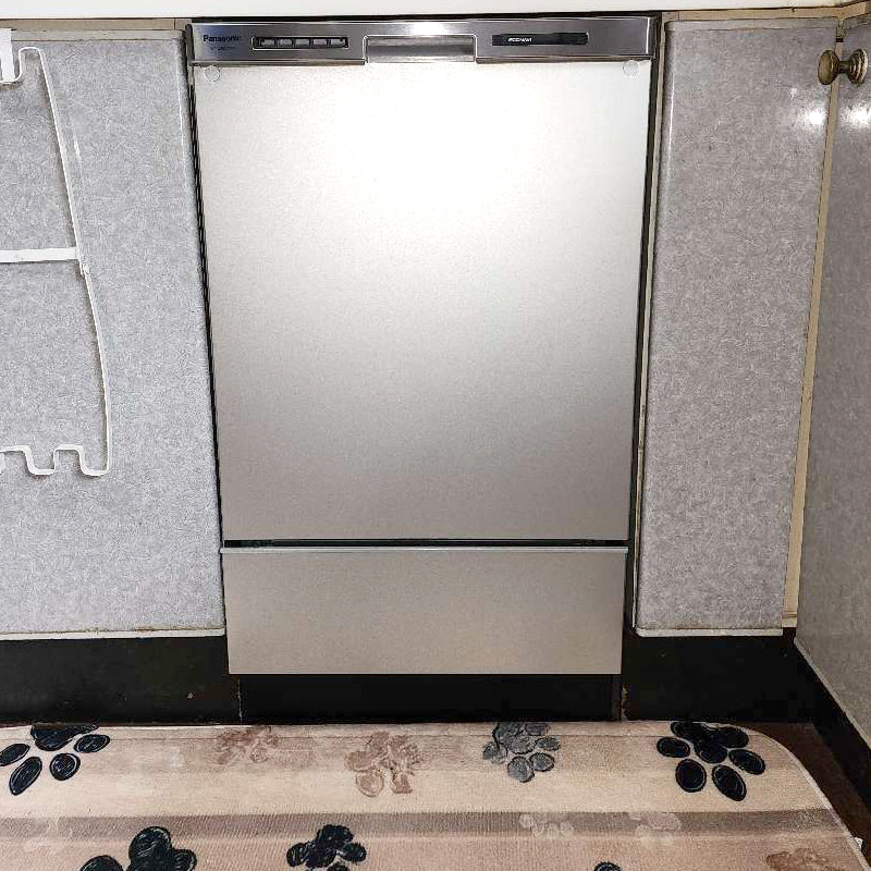 ノーリツ製のNFB4515PMSR(スライドオープン・ディープタイプ・ドアパネル型)の食洗機から、PanasonicのNP-45MC6T(キッチン奥行60㎝対応のスライドオープン・デイープタイプ・ドアパネル一体型)の機種へ交換を行いました。キッチン奥行が65㎝無い場合の対応機種です。「AIエコナビ」や「バイオパワー除菌」などの高機能を搭載しています。庫内には「ムービングラック機能」が搭載されており、上かごを横にスライドすることができるので食器のあとから追加もラクに行っていただけます。