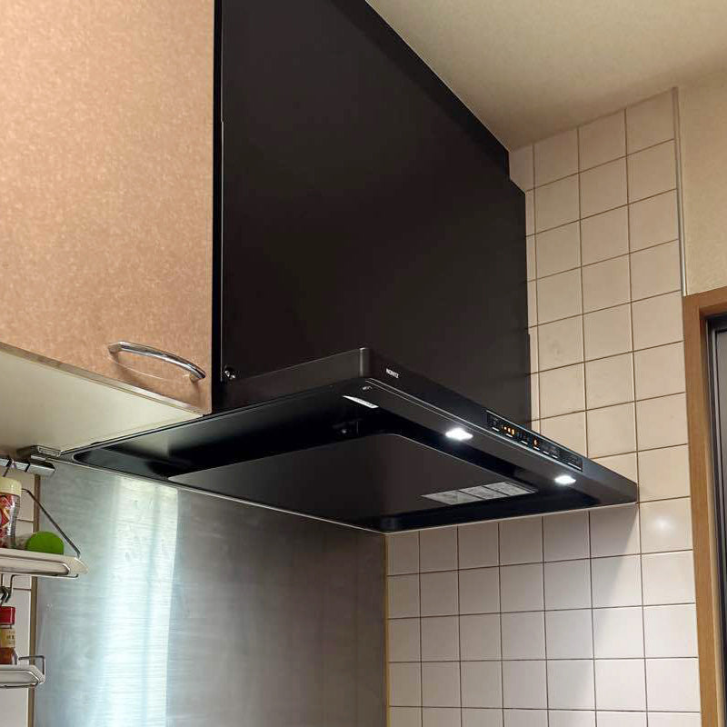 Nationalのレンジフード(W900・T-090HESAR-K)からNORITZのクララ連動無し(W900・NFG9S25MBA)への交換を行いました。クララ連動無しは操作しやすい独立スイッチとお手入れ簡単でキレイを保てる設計のレンジフードです。本体や整流板にはオイルガード塗装が施されているため拭くだけで簡単にお手入れができます。キッチンタイマーが操作部に内蔵されているので、キッチン周りもスッキリし、調理時には便利にご活用いただけます。ブーツ型からスリム型に変更したことで、キッチンが以前よりもスッキリと感じられます。