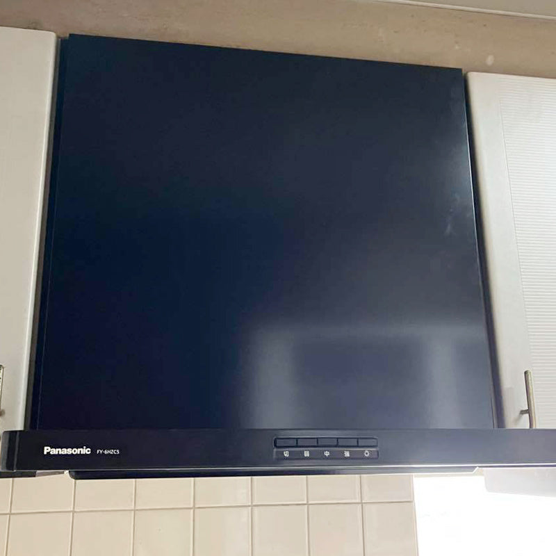 NAiS製のSEE12AH(ブーツ型・プロペラファン・ブラック・W600)から、Panasonic製のFY-6HZC5-K(スリム型・シロッコファン・ブラック・W600)の機種へ変更を行いました。HZCシリーズは基本的な性能を備えたお掃除のしやすいシンプルなレンジフードです。撥水性のクリーンフィルターが搭載されており油汚れが付きにくくお掃除の手間も軽減します。消費電力の少ないLED照明を搭載しており、エコで家計にも優しい仕様です。