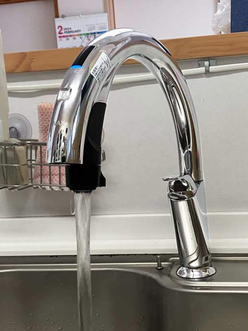 標準のキッチン水栓からタッチレス浄水器へ交換を行いました。100Vの電源が必要になるためキッチンの食洗機の電源から分岐工事を行い、電源を確保しました。 吐水も止水も自動のため、操作も快適。ナビッシュでシンク作業がスイスイはかどります。