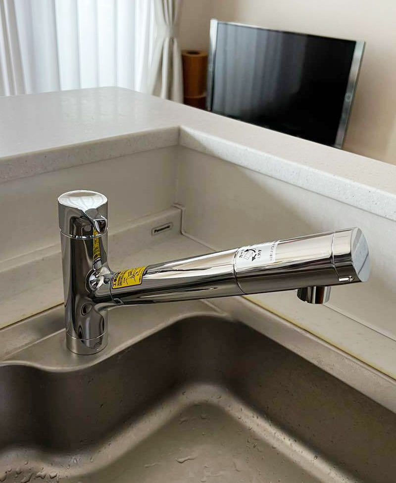 TOTOのGGシリーズ(TKS05307J)への交換を行いました。GGシリーズはシンプルなデザインが特徴の浄水カートリッジ内蔵型のキッチン水栓です。吐水口の先端を回すことで簡単に吐水切り替えができます。