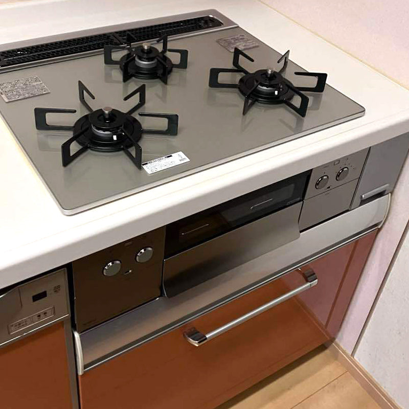 リンナイ製のリンナイスタイル(RB32AH2S・両面焼・W600)からノーリツのネスト(N3WU6PWAP2STE・無水両面焼・W600)への交換を行いました。美しいツヤが特徴で衝撃に強いガラストップ天板を採用したガスコンロです。ダイヤル式のプッシュボタンとフラットなフェイスデザインはお手入れがしやすく高級感があります。「オートグリル機能」や「ダブル高火力&ダブルとろ火」を搭載。オプションのロティプレートを使用することで、魚料理以外も調理も簡単に行っていただけ、レパートリーの幅も広がります。
